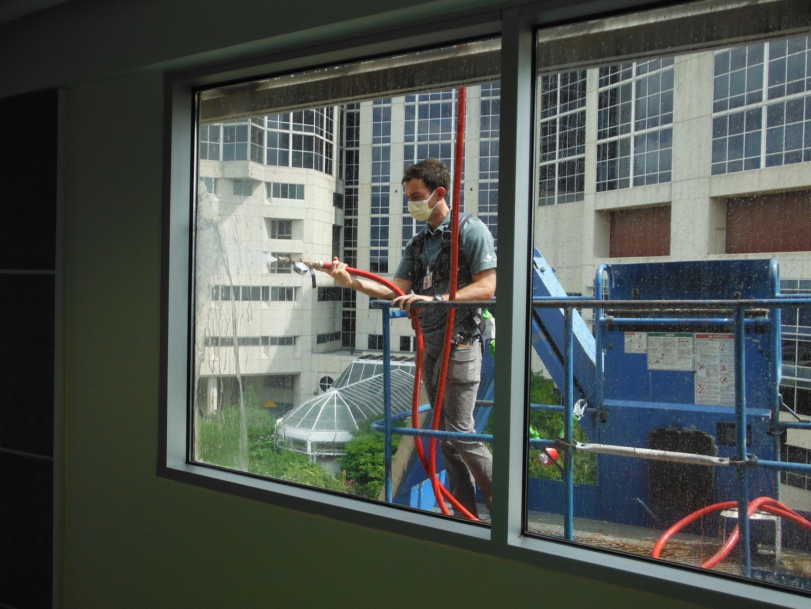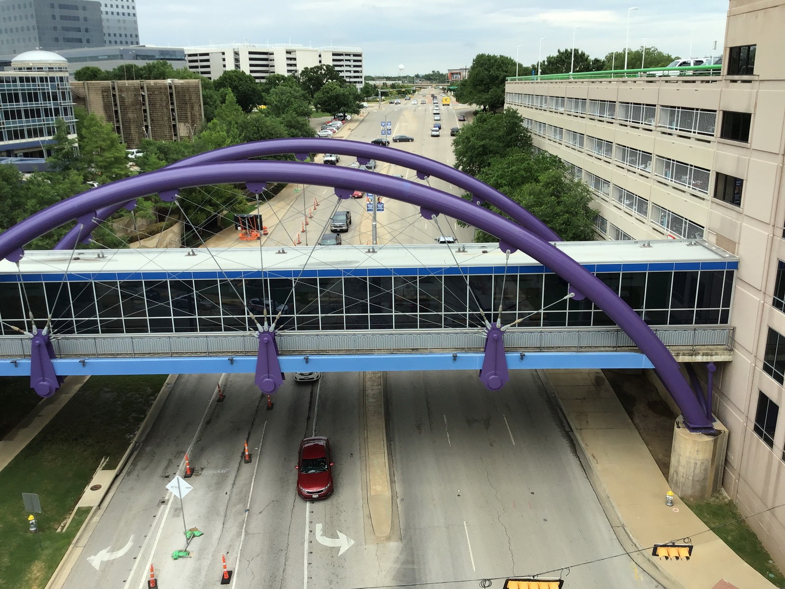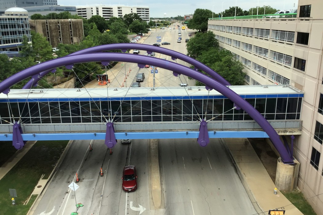 The CH campus also contains skybridges to facilitate pedestrian foot traffic across roadways and train tracks. The three skybridges involved in WJE’s investigation were constructed between 2003 and 2007, with lengths between 185 and 240 feet. Each bridge features aluminum-framed windows and metal wall panels.
