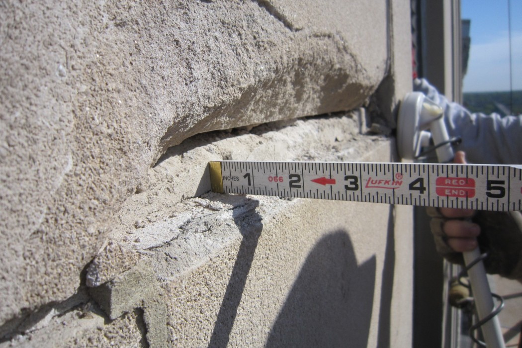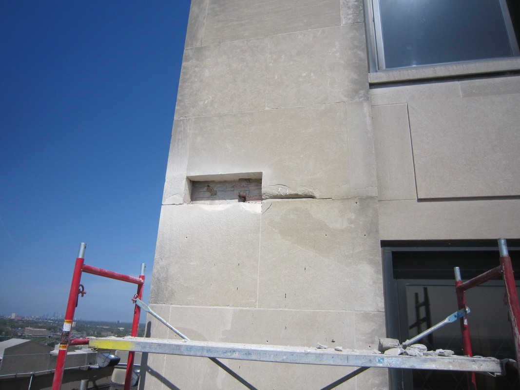 WJE was retained on behalf of a prospective lender to identify the level of repair that may be necessary to the exterior stone facade of the building. The client requested that WJE identify observable deficiencies in the facade, develop a schedule of recommended repairs, and prepare cost estimates to address the deficiencies found. The scope of the review was limited to visual observations to record general conditions, as-built dimensions, extent of visible distress, and locations of apparent wall panel movement in order to prepare a summary report.
