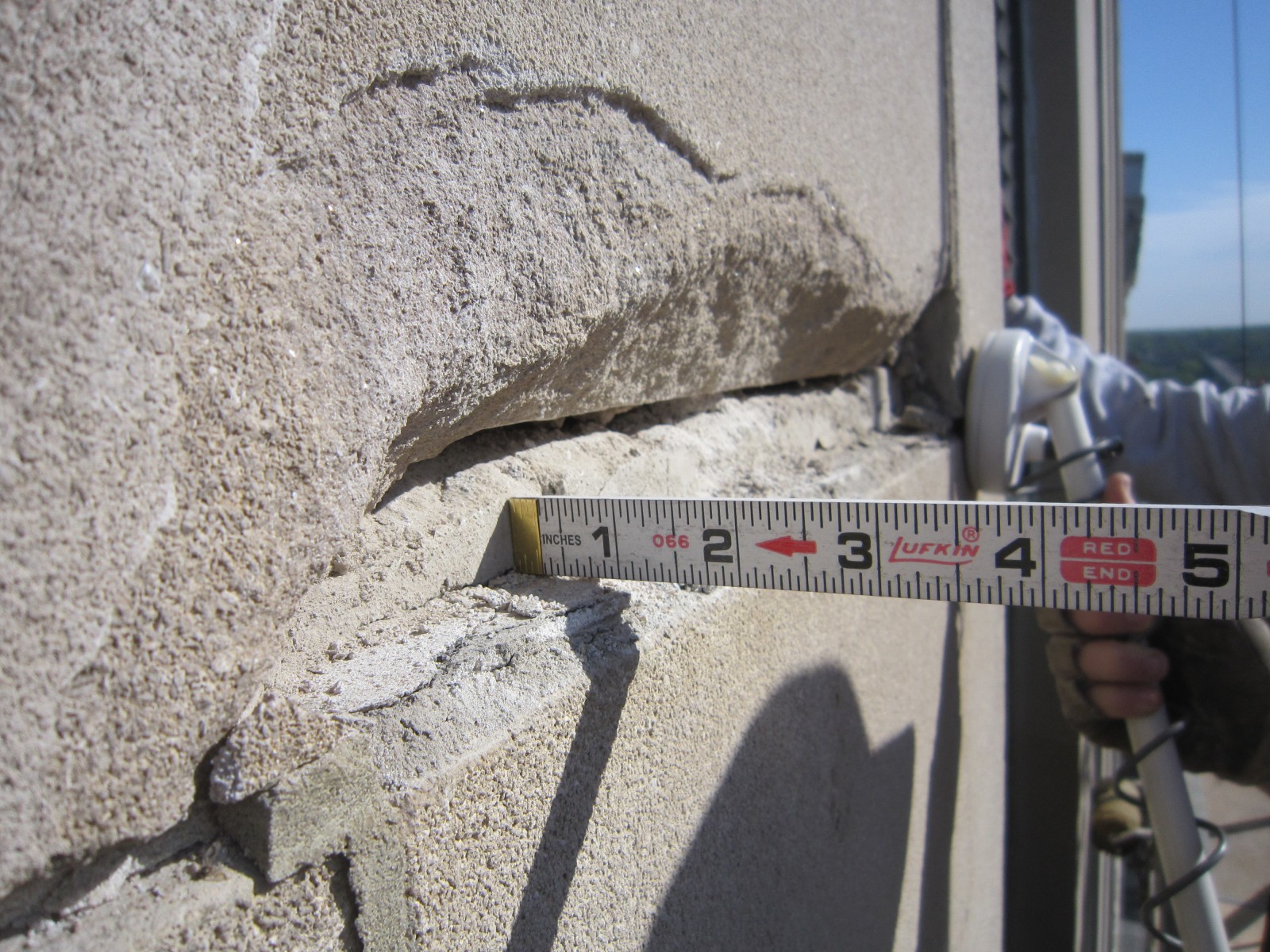 WJE engineers reviewed original drawings and documents and interviewed the current building management company in preparation for the inspection. WJE performed a close-up visual inspection of the building's facade from swing-stage scaffolding, performing inspection drops in strategically selected areas that would replicate typical details on other areas of the building or were likely to exhibit problematic conditions. Selection of representative areas in this manner permitted the extrapolation of conditions for the entire building facade. WJE engineers prepared prioritized repair cost estimates to allow the client to perform repairs in accordance with safety concerns and availability of funding. Separate estimates to address water penetration issues and aesthetic concerns were created so the client could prioritize and address issues in accordance with their budget and schedule.