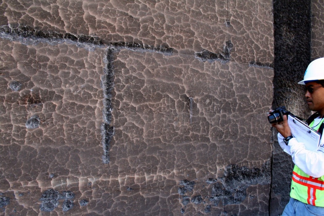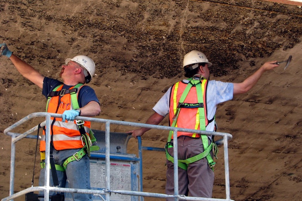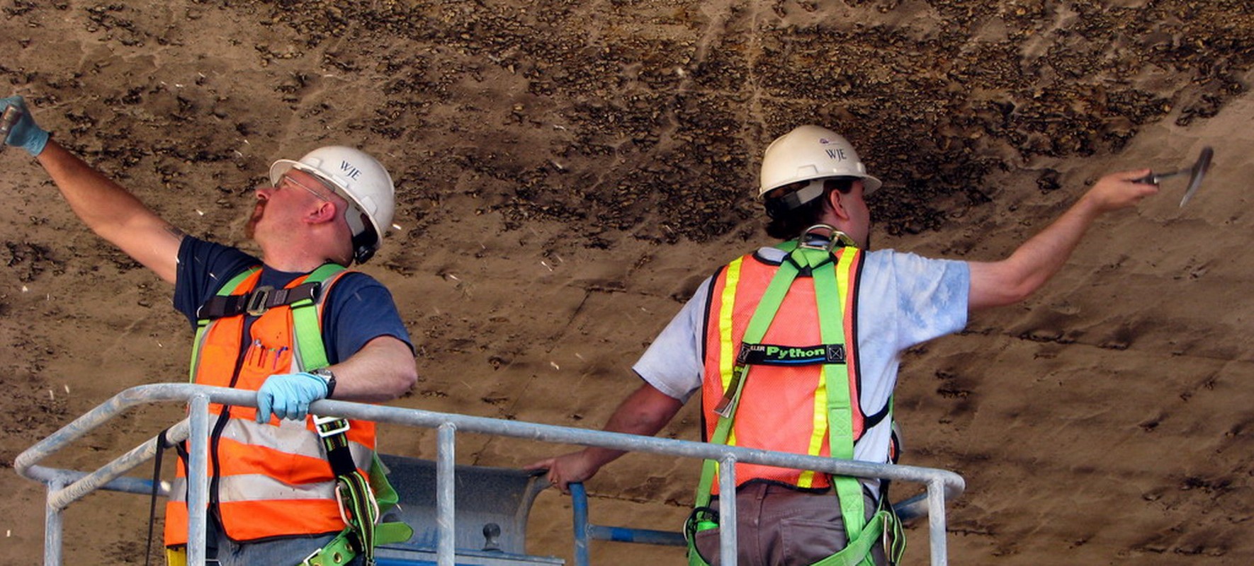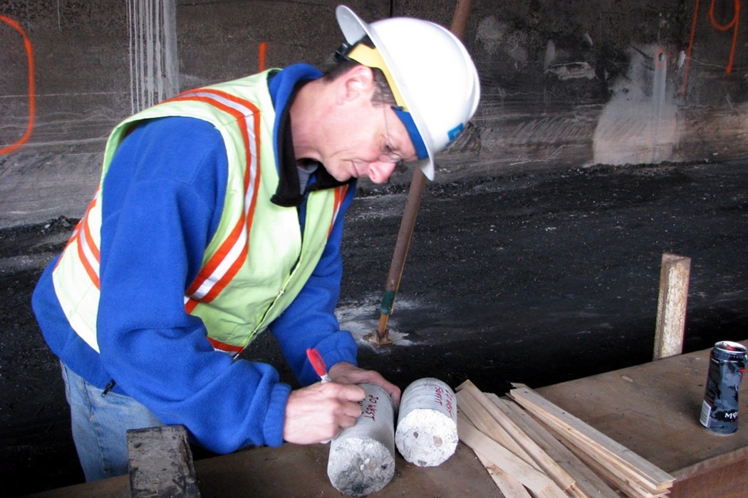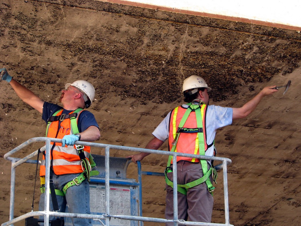 WJE engineers performed a variety of physical and nondestructive tests on the overpass concrete, including visual observation, acoustic impact testing, petrographic studies, compressive strength testing of concrete cores, and tensile strength testing of reinforcing steel. After testing and analyzing the samples, the team provided Caltrans conclusions regarding the condition of the concrete and recommendations for the repair or replacement of the concrete where necessary.