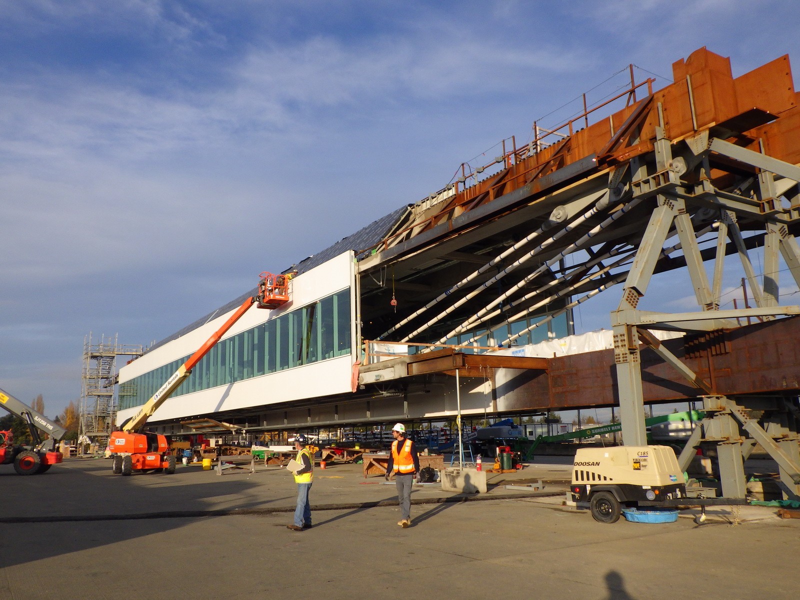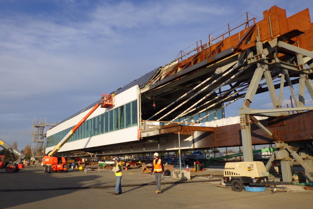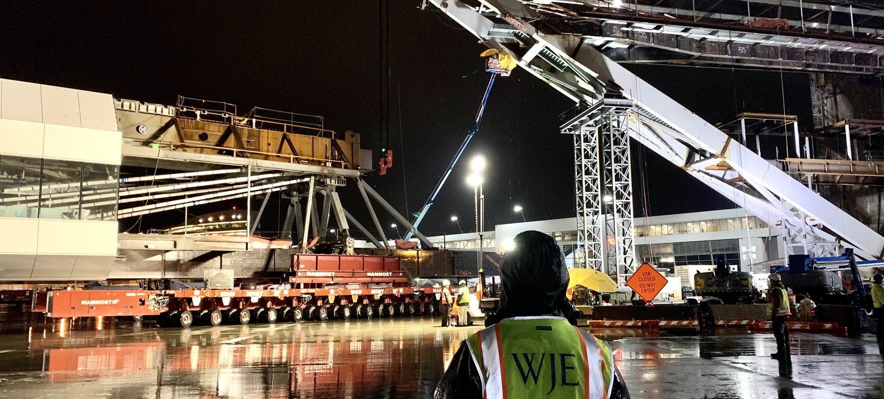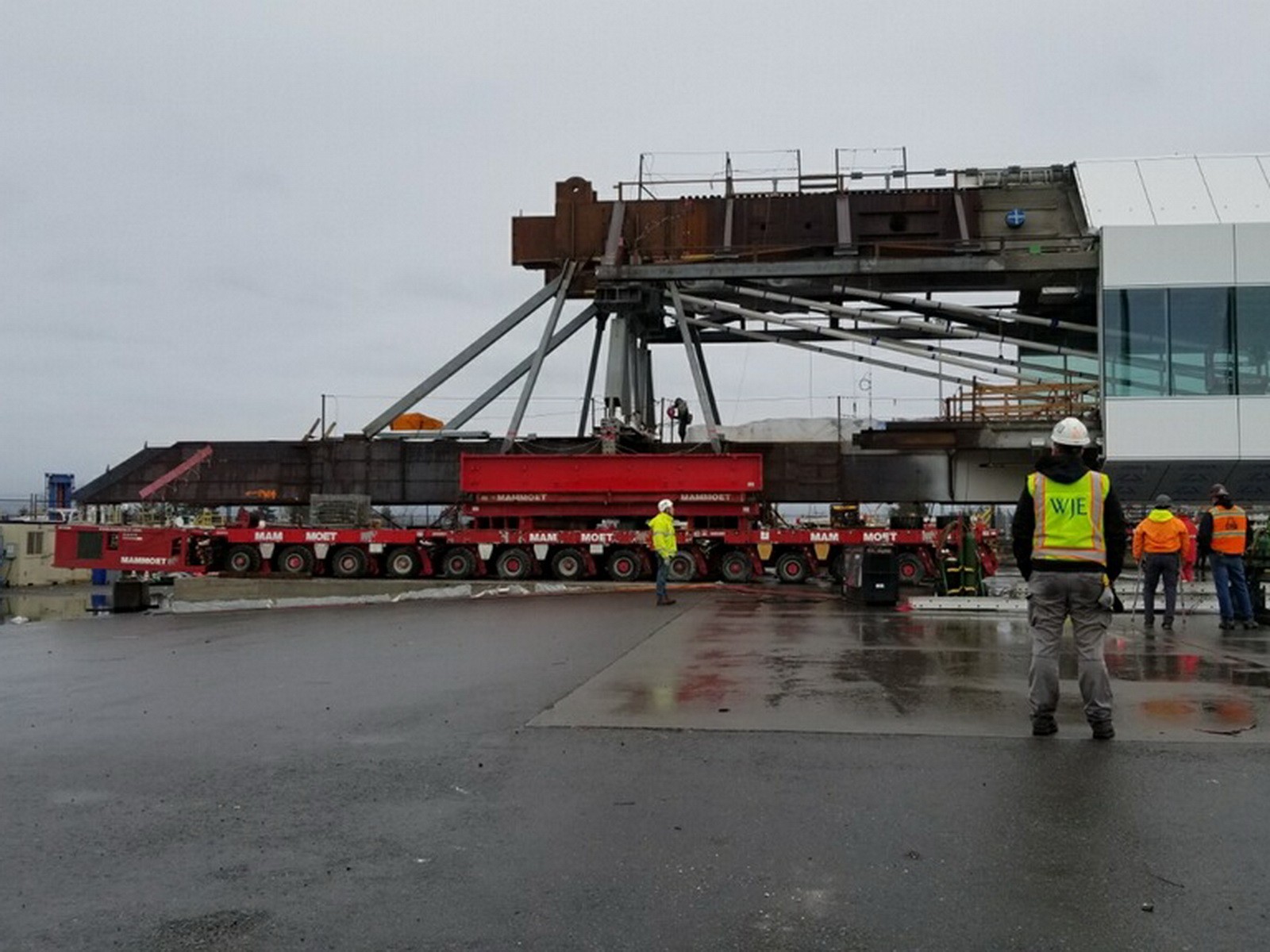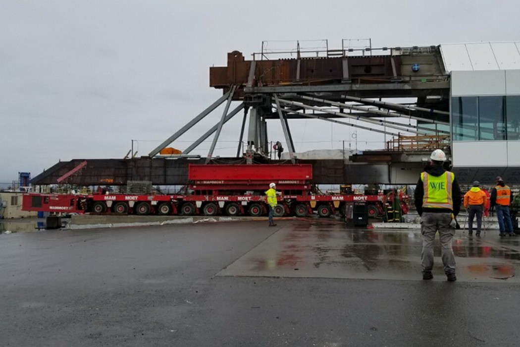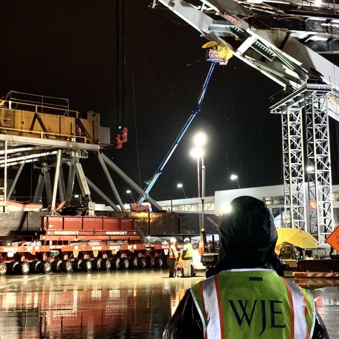 The center span reached its destination, and data collected by WJE gave the Port and project team confidence that the move was not detrimental to the structure and that the bridge was safe and ready to lift to its final position eighty-five feet above the Sea-Tac taxiway.