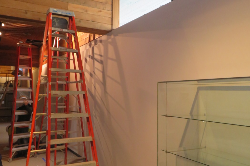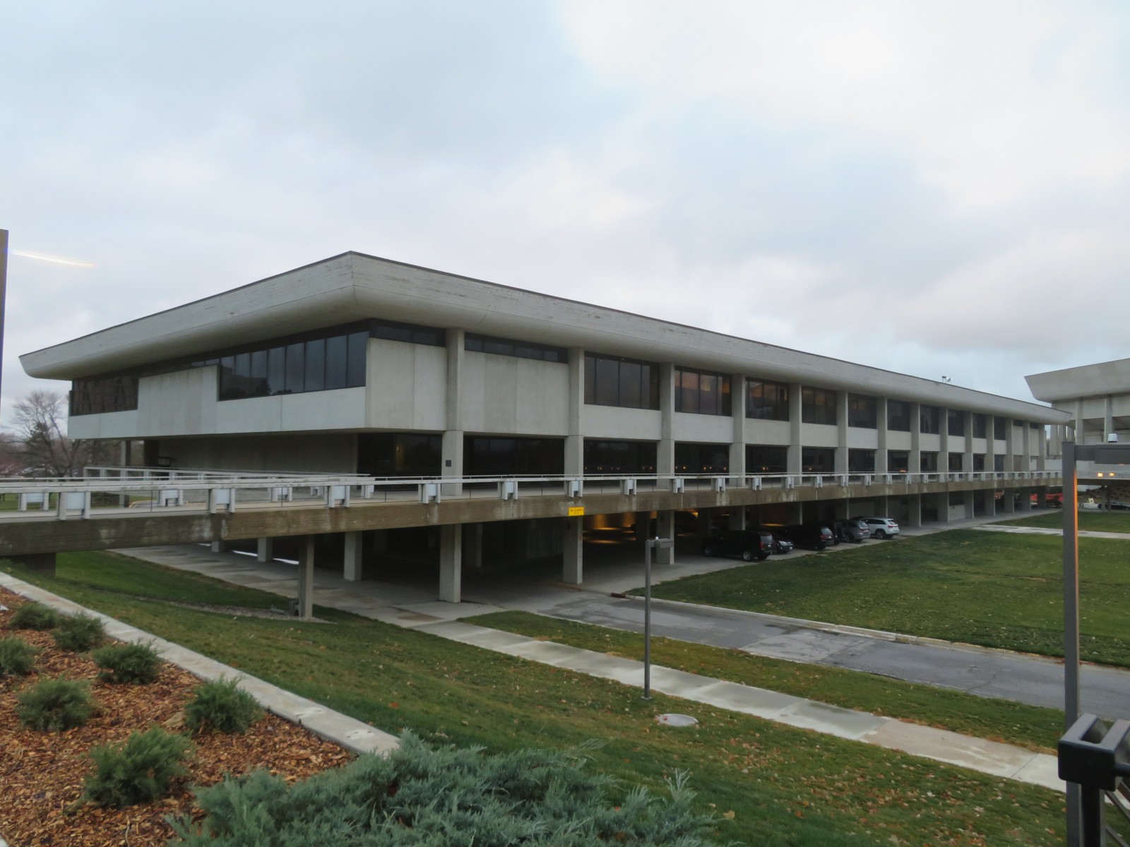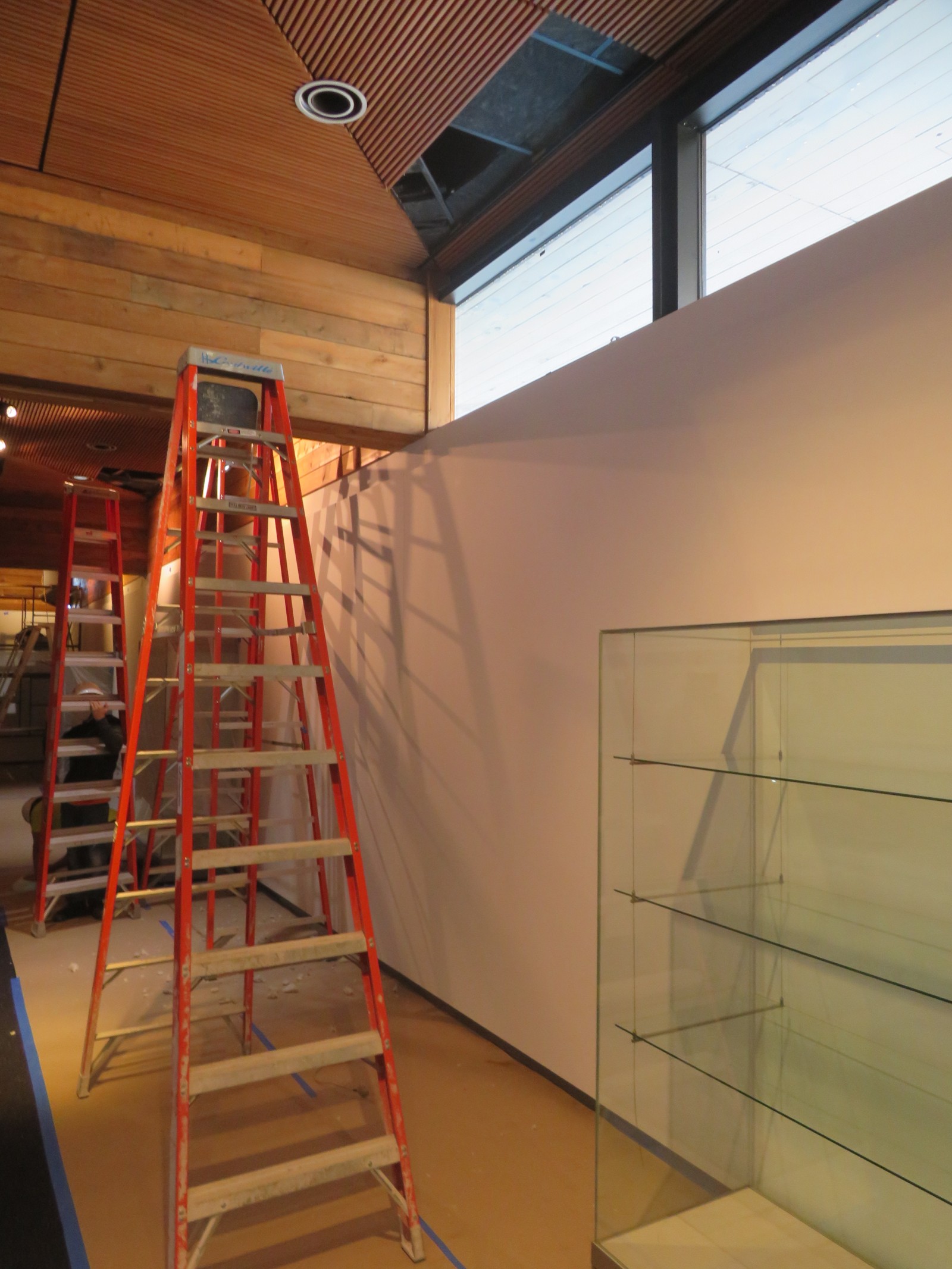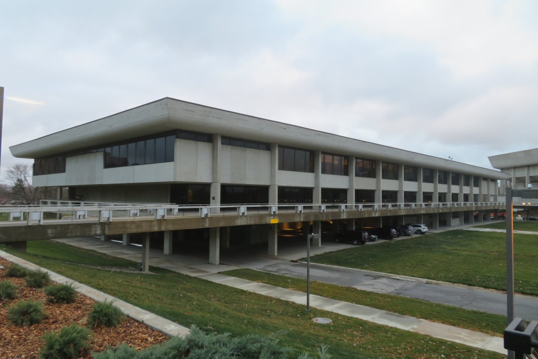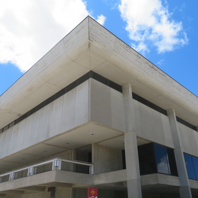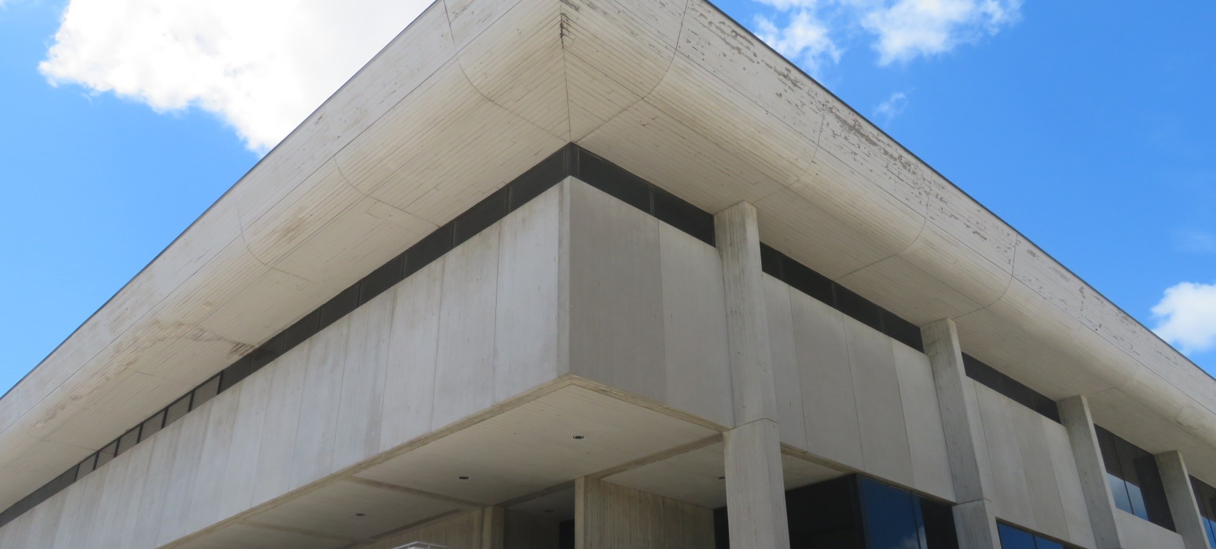 The Scheman Building was completed in 1975 and the facade is primarily constructed with expressed cast-in-place concrete structure with precast concrete cladding. Steel and glass glazing systems infill openings in the concrete. Only a small section of clerestory windows within the museum is exposed on the interior; otherwise, the windows are concealed by cedar boards. The roof overhangs the exterior wall of the museum and the underside of the overhang is vented and clad with painted wood cedar boards.