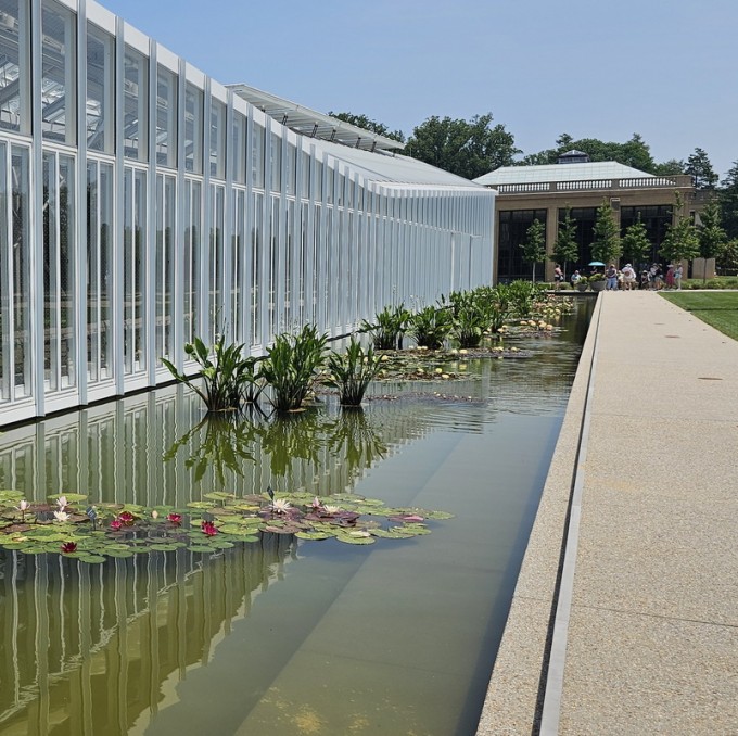 The West Conservatory is a new glass-enclosed building consisting of 32,000 square feet of underground basement and a 32,000 square foot elevated slab. The gardens, which are constructed above occupied space, appear to float on water, allowing the plants to thrive within a controlled environment. The water feature also includes movable planters.