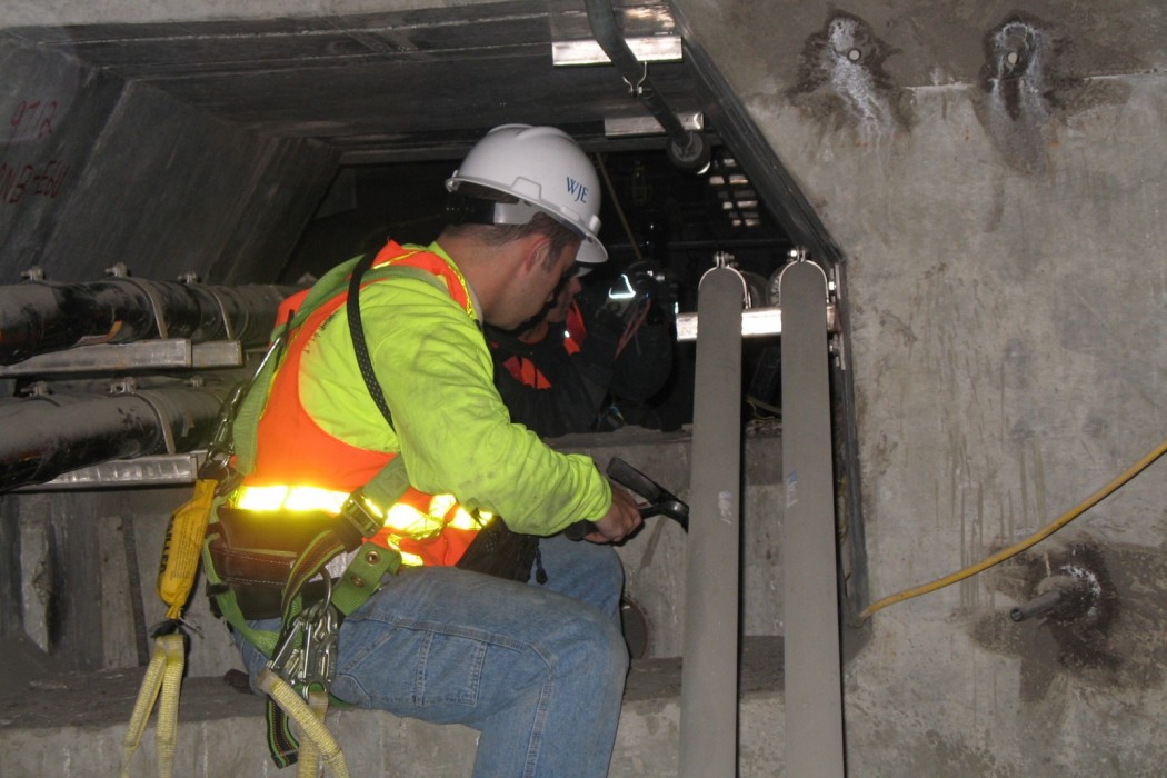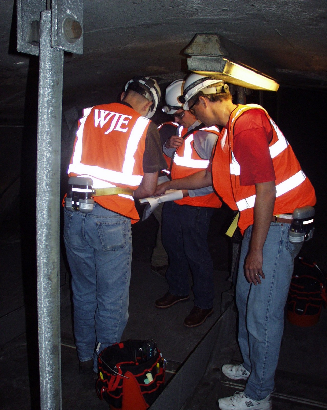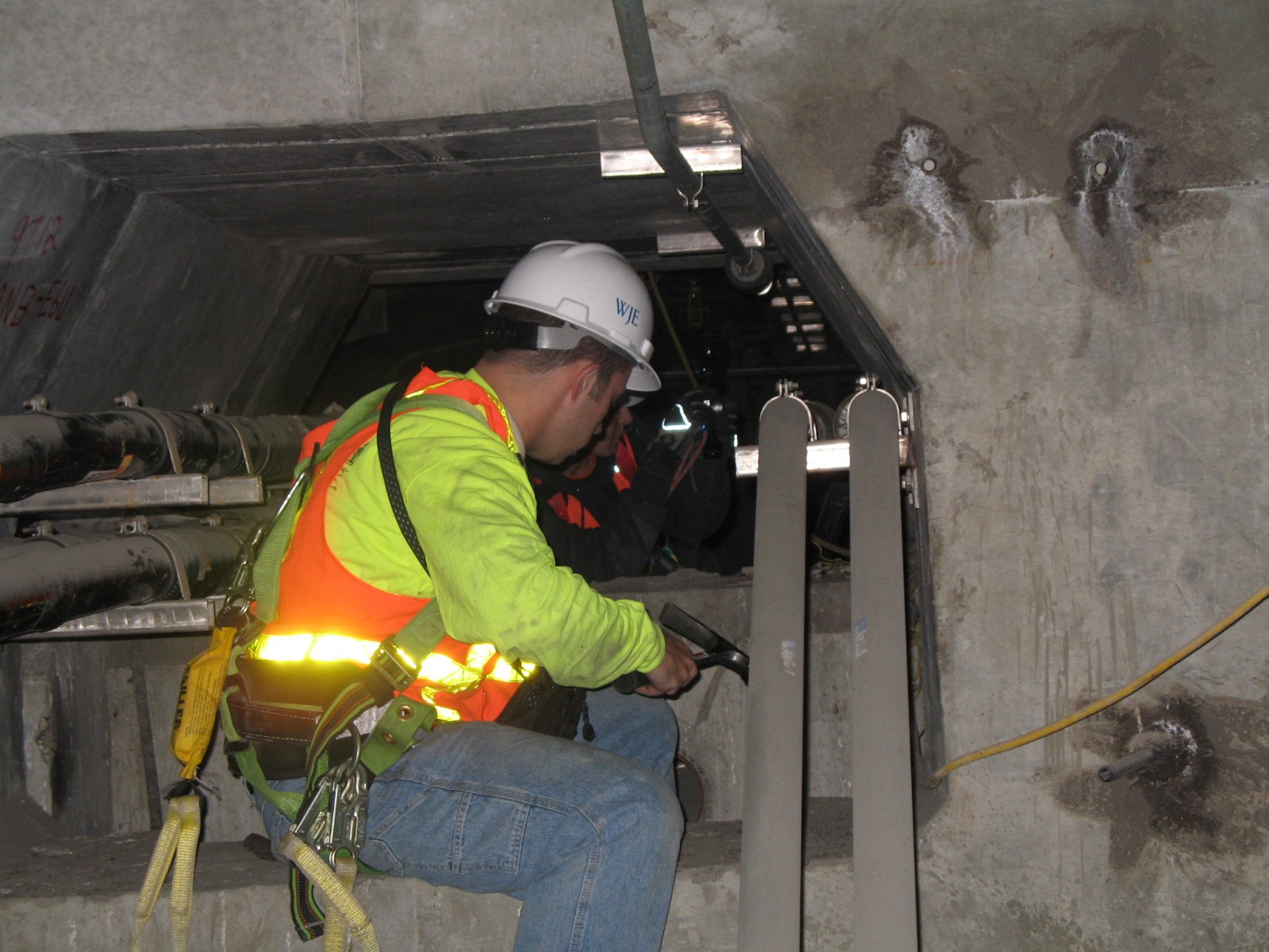 Phase I of the project consisted of a review of the Big Dig tunnel structures and finishes, including precast and cast-in-place concrete and steel-framed tunnel structures, precast concrete and metal ceiling panels, tile wall finishes, epoxied anchors, and appurtenances. WJE's work included extensive field investigations, consisting of visual inspections and nondestructive testing, with subsequent finite element analyses of critical components.