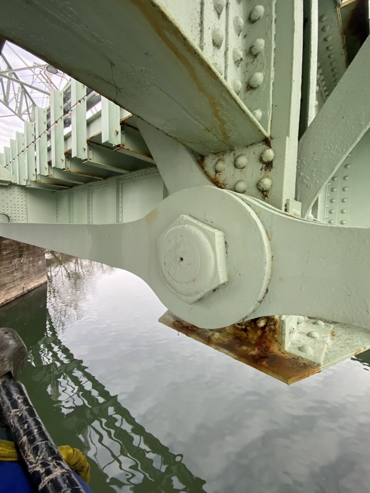 With access provided by a barge lift on the river and a bucket truck on the roadway, the WJE team conducted an arms-length survey and observations of fracture-critical members of the bridge structure both above and below the roadway surface and nondestructive evaluation using ultrasonic techniques on sixty-four fracture critical transfer pins. The team also oversaw an underwater survey of the bridge piers and their foundations to assess their condition below the water line and to evaluate evidence of scour.