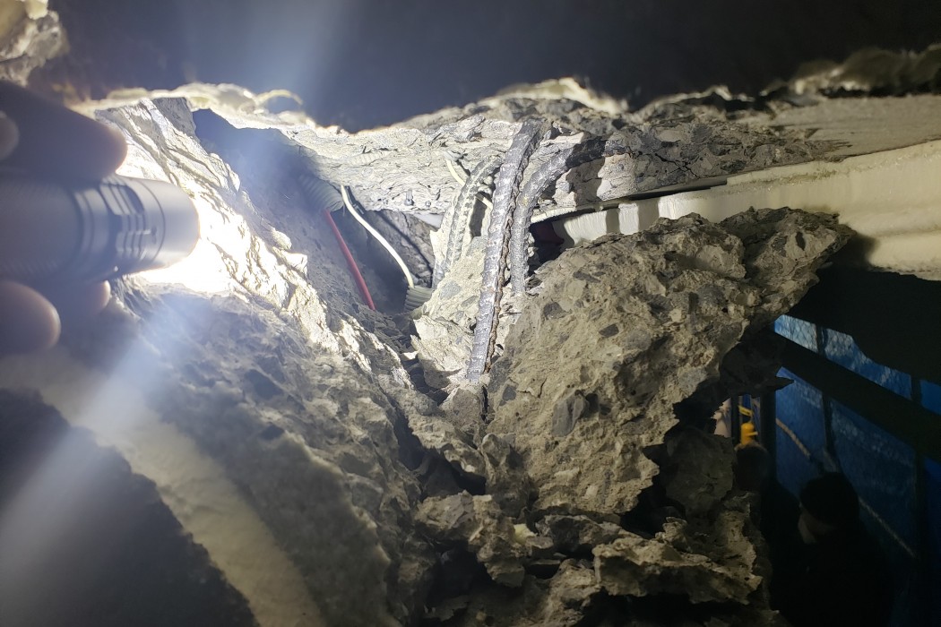 WJE was on site the day after the collapse to document the in-situ condition of the collapsed slab. We performed nondestructive testing and took material samples of the concrete, post-tensioning, and reinforcement. We then performed a detailed review of all design documents, shop drawings, and special inspections from the original construction. Following our review, we issued a report indicating the cause of the collapse. In addition, we performed a peer review of the repair design and performed construction period services for the repair on their behalf. Following the repair of the Allure, we visually inspected an additional four buildings developed by the same team utilizing a similar construction type and provided recommendations for repairs for further investigation by the developer.