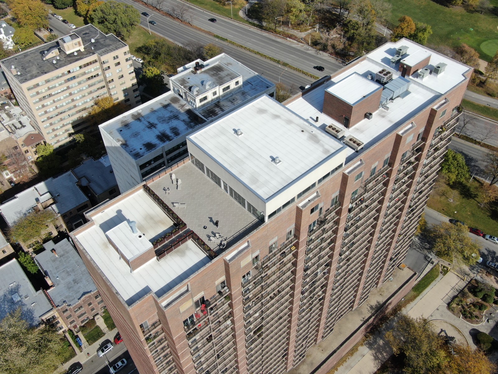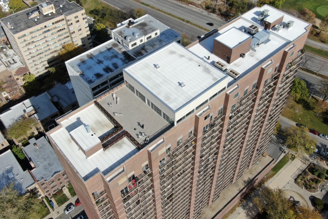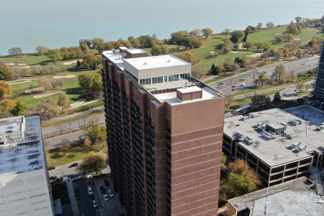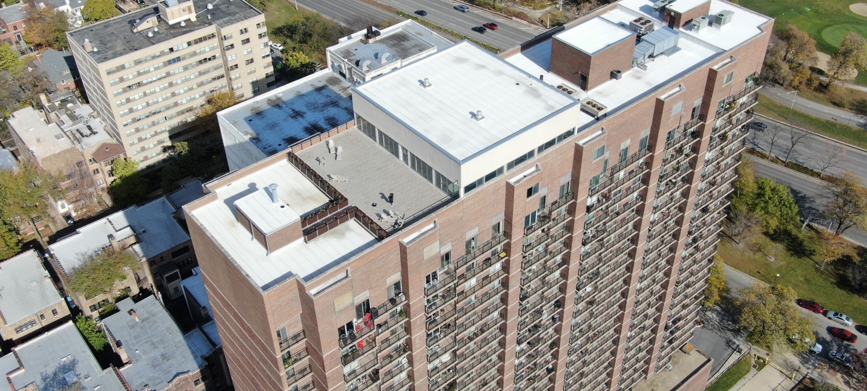 In 2014, the City of Chicago required that the building remove wood materials that framed the previous sundeck in the west roof area to comply with fire regulations. In 2015, WJE performed a roofing condition assessment and recommended replacement of the west roof prior to installation of a new sundeck. In 2017, WJE designed the roofing replacement for the west roof, which included the addition of a new concrete paver sundeck. In 2019, WJE designed the roofing replacement for the east roof, which included the replacement of four HVAC units by helicopter airlift.