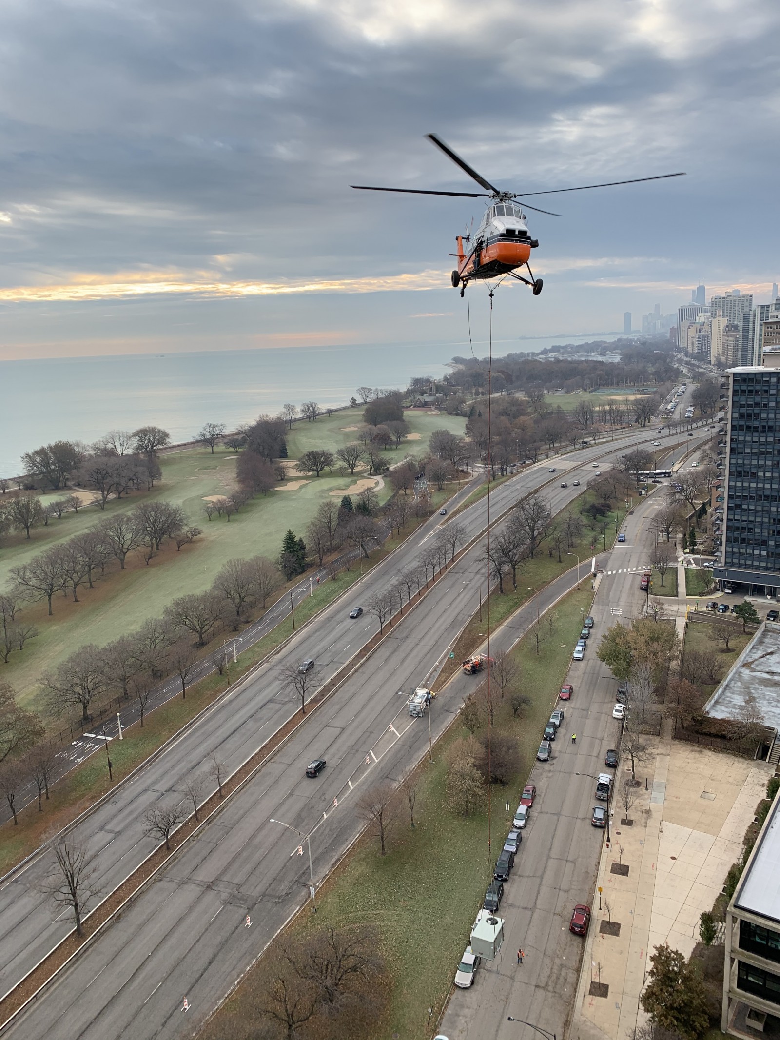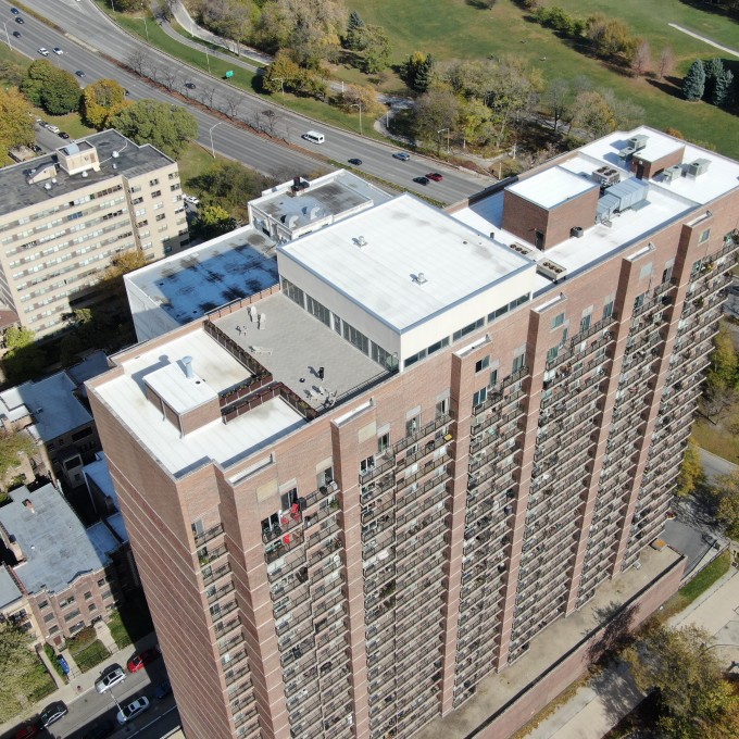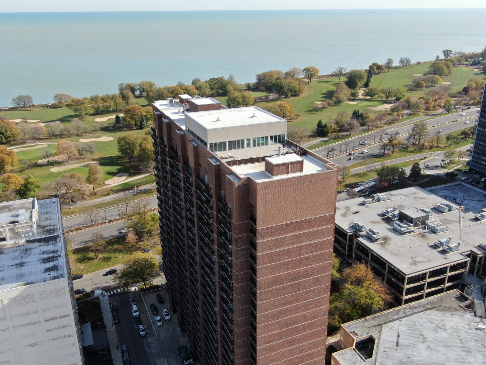 In 2014, the City of Chicago required that the building remove wood materials that framed the previous sundeck in the west roof area to comply with fire regulations. In 2015, WJE performed a roofing condition assessment and recommended replacement of the west roof prior to installation of a new sundeck. In 2017, WJE designed the roofing replacement for the west roof, which included the addition of a new concrete paver sundeck. In 2019, WJE designed the roofing replacement for the east roof, which included the replacement of four HVAC units by helicopter airlift.